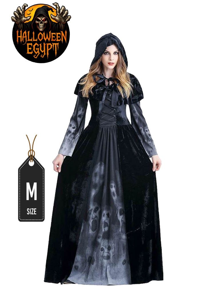 Rule the night with this long black ghost queen gown, featuring subtle smoky prints and a hooded cape. Perfect for Halloween or mysterious masquerades. فستان أسود طويل بإطلالة غامضة مع قبعة أنيقة تمنحك حضور مهيب وجذاب.