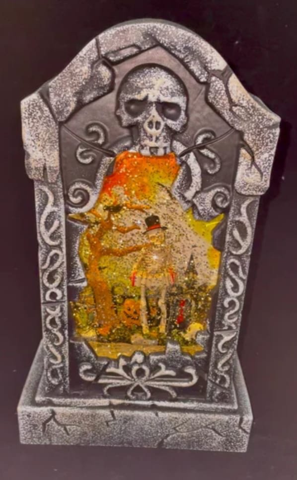 EN: LED tombstone with glitter effect — glowing grave vibe for spooky setups. AR: شاهد قبر مضيء عليه جليتر، بينور وبيعمل جو مرعب جدًا.